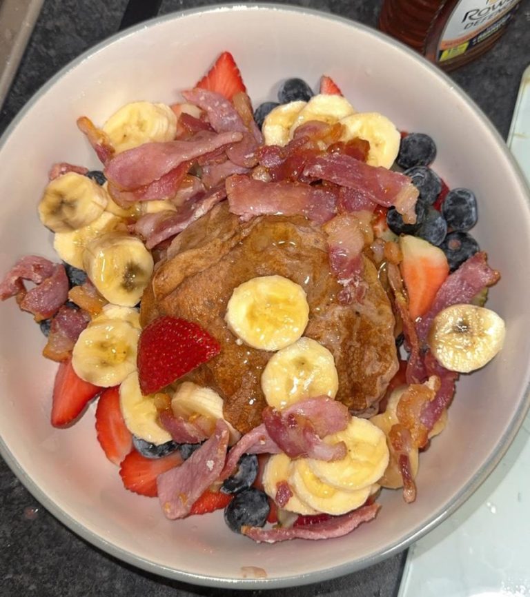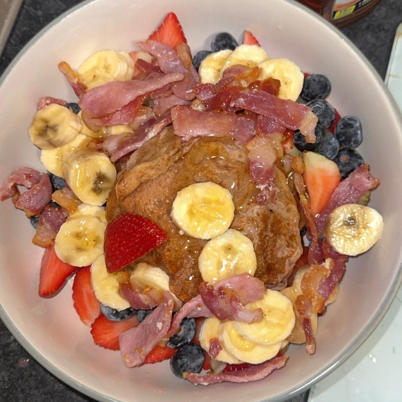 Honey Glazed Protein pancakes w/ Bananas Strawberries and Blueberries & Bacon - $30